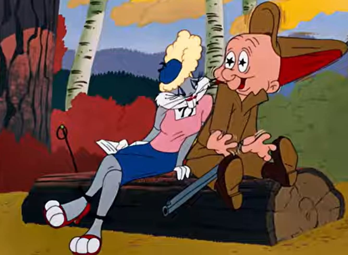For those keeping score, here we have a male rabbit dressed up as female human prostitute, flirting with a human male who either has the world’s worst eyesight or its most debased sexual kink. Whatever the case, his flaccid hunter’s cap magically elongates and stiffens, to complement the rifle in his lap.